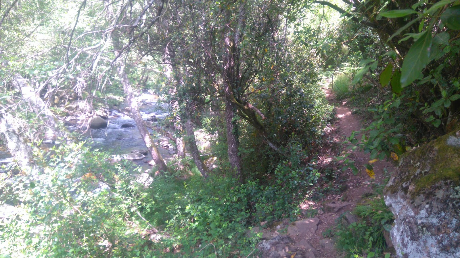 El sábado 23 de abril, cuando la primavera luce sus mejores galas, pletórica la naturaleza, siendo las 11 de la mañana de un día luminoso, me dispongo junto a mi compañera a realizar la alabada "ruta de los pescadores"; ahora bien, con una peculiaridad, en lugar de iniciar la misma desde el habitual punto de partida sito en Arenas de San Pedro, aconsejado por un amigo, invierto su trazado para comenzar a caminar desde el extremo opuesto, ubicado en el Puente y Ermita de Los Llanos (al que se accede por la carretera LE-502 en sentido a Candeleda, cuya intersección con la N-501 de Ávila, se halla antes de llegar a Ramacastañas, viniendo de Talavera de la Reina). Estaciono el vehículo junto al puente del río Arenal, cruzado éste, y una vez pertrecho de todos los aparejos, reparo poco antes de ponerme a andar, en un pájaro de bella estampa posado en una de las ramas de un magnífico ejemplar de roble, a mi parecer -sin ser un experto- podría tratarse de un alcaudón real, con larga cola, antifaz negro en su cabeza y un gris azulado brillante en el dorso; buena señal me digo para mis adentros, e iniciamos el paseo por la orilla derecha del río según nuestra marcha, por tanto, dejamos el río a nuestra izquierda, es decir, por la margen izquierda del cauce. Nos adentramos por un estrecho sendero en un frondoso bosque de ribera, con una cubierta vegetal de follaje y espesura de intenso color "verde primavera" que lo impregna todo. Entre las especies arbóreas que predominan y distingo están los alisos, sauces, fresnos...que conforman un abigarrado bosque de galería, flanqueando en sus orillas el cauce del río, sus aguas corrientes fluyen sin cesar emitiendo sonidos orquestados conformando una auténtica sinfonía con el dulce canto de los pájaros que pueblan el sin par paraje, una auténtica maravilla que se asocia al edén; así en los remansos del río se acumulan las arenas dando lugar a pequeñas playas o arenales -ideales para un baño en época estival-, la transparencia de sus aguas cristalinas dejan ver el fondo del lecho cubierto de cantos rodados, me impresiona la reverberación de las imágenes que se reflejan en el agua, esos troncos alargados y grises espejados, que parecen moverse y distorsionan sus contornos, me recuerdan los cuadros de paisajes de los pintores impresionista (Monet, Manet ...). Más adelante, la densidad de la vegetación herbácea resulta de una exuberancia portentosa, a destacar la altura de los numerosos helechos, las flores amarillas resplandecientes de los dientes de león, margaritas amarillas, las flores violáceas, tanto azuladas como rosáceas, de los molinillos con sus cinco pétalos en forma de aspas, alberjones, fumarias ...Las balizas de madera van marcando la ruta que discurre a lo largo de la orilla del río, en ocasiones, reviste cierta dificultad en algunos de sus tramos, que requiere una "trepadilla" o descenso agarrándose uno bien a las piedras o canchos escalonados de forma irregular -complicada para niños pequeños, no recomendable para menores de diez años-; el musgo, en las zonas de umbría, tapiza el roquedo granítico que aflora en el suelo, mientras me detengo a fotografiar los frutos del rusco, unas bolitas rojas brillantes, del tamaño de una canica, escucho en la lejanía, en un bosque de pinos que puebla la ladera, el suave y delicado canto de un carbonero garrapinos, en contraposición, con el que escucharé poco después al paso frente a ejemplares de robles y encinas, que resulta chirriante y estridente, de un pinzón. El sendero asciende por el talud de la pared que delimita el valle y el ramaje de unos arbustos cubren a modo de dosel la senda, se trata de durillos y loros, cono hojas semejantes al laurel, ataviados con incipientes flores blancas que embellecen su estampa...También los brezos con sus barbas de viejo, claro exponente de la pureza del aire que se respira por estos lares, y su inflorescencia rosada. Desde una posición de altura, se tiene una visión más global del escenario natural del fondo del valle, las pozas que jalonan el curso del agua, los pequeños saltos de agua donde la transparencia del agua se torna blanca, con matices turquesas en las modestas turbulencias de algún remolino, al embestir contra las piedras...los sonidos en onomatopeyas con sus "glugluteos " incesantes de fondo... no encuentro las palabras adecuadas para describir tanto gozo y tanta belleza -y tan cerca, tan cerca-. A medida que nos separamos de la orilla y vamos remontando la pared, la vegetación va cambiando, mezclándose con especies típicas del bosque mediterráneo, como pinos (pino pinaster), robles, encinas, jaras, jarillas, gamones, olivillas, lavanda o cantueso con sus penachos morados y tiesos -como las plumas de los guerreros comanches-; en definitiva, de gran valor ecológico y que puede resultar de gran interés para botánicos, ornitólogos, ecologistas...y para todos los amantes de la naturaleza, para todos aquellos que saben disfrutar de ella y con ella, en armonía y convivencia. En el recorrido nos encontramos con varios puentes (pasadizos) de maderos ensartados para salvar los numerosos regatos, algunos no en muy buen estado, por lo que hay que cruzar con cuidado; sin embargo, impresiona y llama la atención el espectacular puente de madera que cruza el río para continuar por la otra orilla, su altura es considerable respecto al fondo del cauce - fotos para recordar e ilustrar, una muestra del momento-. Tras cruzar al otro lado por el puente colgante, nos encontramos una tablilla señalizando distintas opciones en la ruta, una marca la dirección hacia Arenas de San Pedro, hacia el Norte, y la otra, rumbo Sur, hacia El Puente Viejo de Pelayos- Poyales del Hoyo- Ermita de Los LLanos. Giramos a la izquierda, rumbo Sur, para volver al punto de partida, y nos encontramos con una maratón CICLISTA de MTB, "Gredos Sur", dado que este tramo de la ruta es ciclable, por lo que debemos estar pendiente