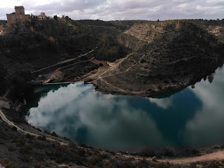 Con la autorización solicitada y concedida por la Consejería de Agricultura y Medio Ambiente de la Junta de Castilla-La Mancha, me presenté en la mañana del día diez, mes de marzo, en el Parque Natural de las Hoces del Cabriel; si bien, estacioné en la parte alta, junto al bar del camping donde se halla un estacionamiento reservado a autobuses, me equivoqué pues se puede llevar el coche hasta el cauce del río donde se está el centro de información y un parque de multiaventura. Comenzamos la ruta a la altura de una plantación de almendros, que estaban en su apogeo, bien floridos, tomamos el camino por la margen derecha del río, poco señalizada, que discurre por un bosque de ribera, en el primer tramo, donde destaca el álamo blanco. Poco después, atravesamos algunas parcelas labradas, con plantaciones de olivos, sin apenas cultivos, para adentrarnos en el bosque típico mediterráneo, con sus pinos, coscojas, madroños, brezos...pero lo que más me llamó la atención fue el romero en flor /recordando aquella canción: vente conmigo niña con el romero en flor, por los cañaverales, junto al arroyo cantor... Además, el canto de los pájaros, próxima la primavera, alegraba la marcha dando una nota de musicalidad y armonía. En el tramo medio, divisamos los imponentes cantiles aserrados de los cortados rocosos que flanquean a ambos lados el valle, algunos muy afilados como chimeneas con sus pináculos o agujas, los cuchillares de las cimas, los estratos verticales de las alturas, las multiformas caprichosas que la erosión del agua ha labrado en la roca calcárea...fijo la atención en el óculo abierto en la pared rocosa, mientras suena en las altura una especie de "grito o chillido de un niño", un sonido muy agudo, tal vez de un águila al que no consigo ver (podría tratarse de un águila real que tiene su hábitat en el lugar), tengo suerte, pues apenas hay gente, dedico tiempo también a fotografiar: los cortados, los juncales y carrizos que alimentan las aguas sosegadas del río, su llamativo colorido variopinto, desde el verde esmeralda hasta el azul zafiro, las algas pardas complementan el atractivo, momentos para caminar y disfrutar, que si tienes la fortuna de aderezar la marcha en buena compañía resulta una primicia. Las caras de los farallones pétreos se tiñen de distintos colores: desde el pardo terroso al rojizo del óxido de hierro, pasando por los grises hasta alcanzar el negruzco de los hongos que se aferran a la superficie. Alcanzamos un pequeños túnel excavado en la roca, con una ventana que nos encuadra la foto del río, tomamos la instantánea plena de colorido...Toca descansar y el cuerpo alimentar, nos protegemos del viento en un abrigo rocoso, al regoviento, mientras observamos y contemplamos; tras lo cual, continuamos hasta llegar a la estructura metálica de lo que fuera en otro tiempo un puente que enlazara con la otro ruta, que discurre por la margen izquierda por tierras de Valencia, sin embargo, solo queda el esqueleto de hierro sin travesaños. Llega el momento de dar media vuelta y volver por la misma senda, cantos de pájaros, el silbo del viento, los acantilados como monumento, las aguas amansadas y engalanadas con sus lindos colores...
