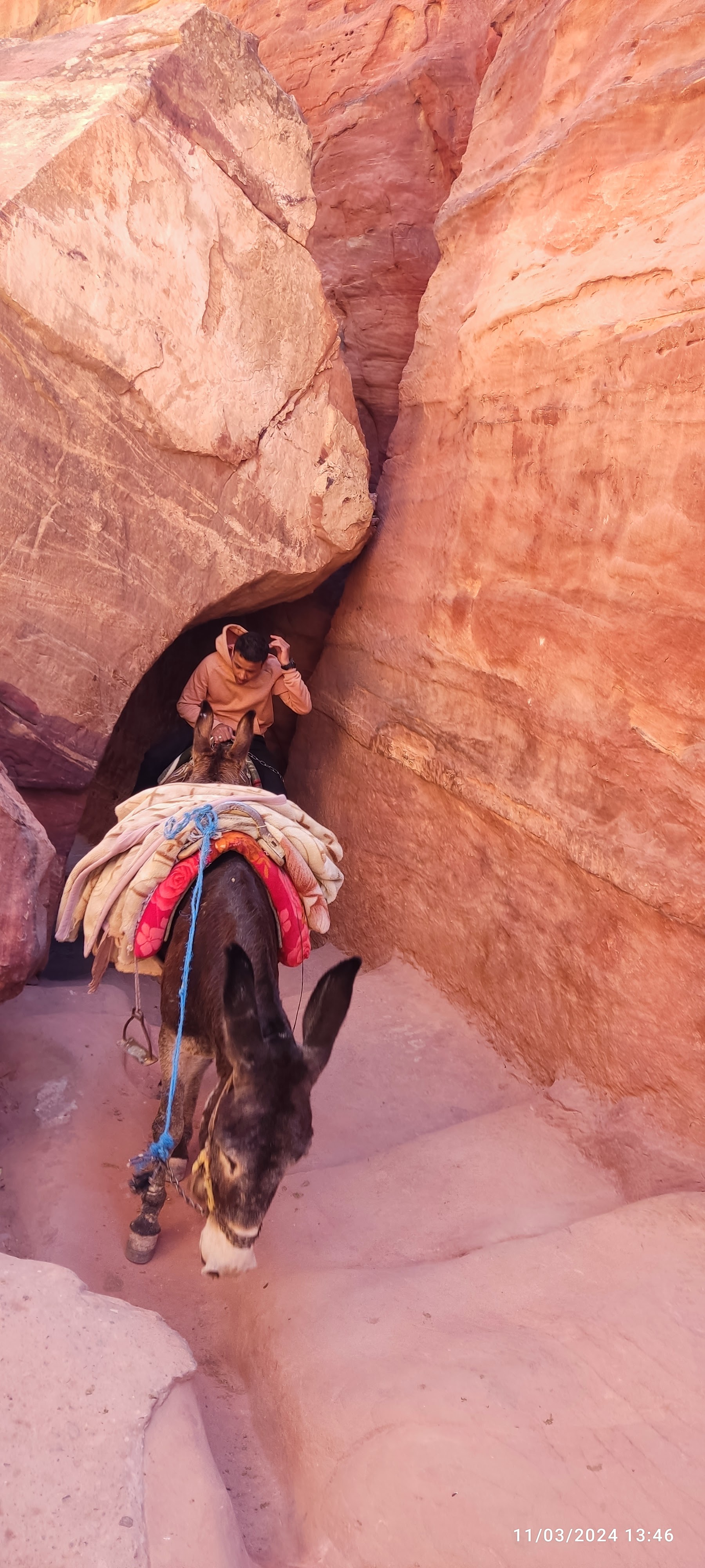 Llama la atención el colorido de la arenisca rosa, en distintos tonos, dependiendo del reflejo de la luz y de las sales minerales disueltas en la roca. El pasear tranquilamente, siendo un afortunado con muy poquita gente, a lo largo del Siq resulta de lo más emocionante, una experiencia indescriptible, un auténtico disfrute.